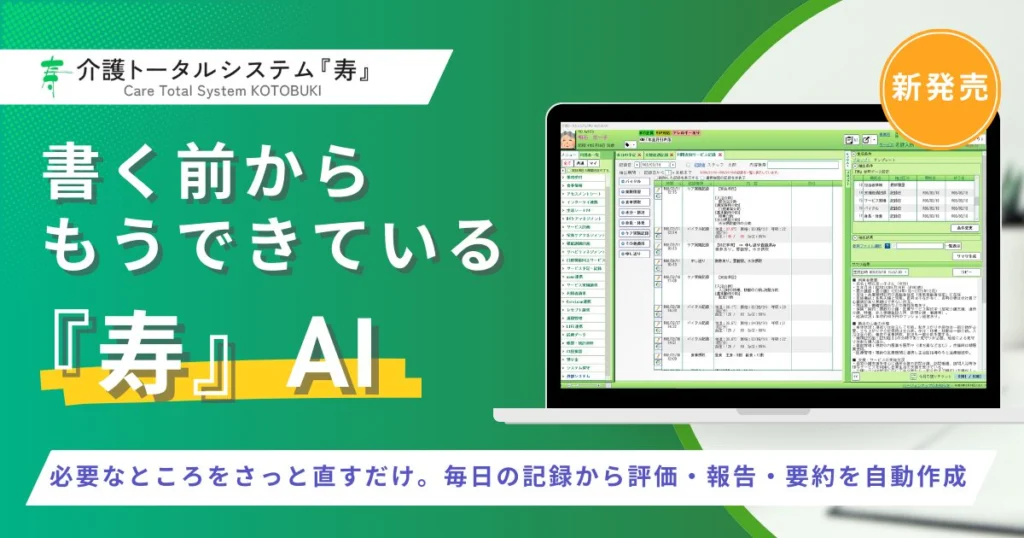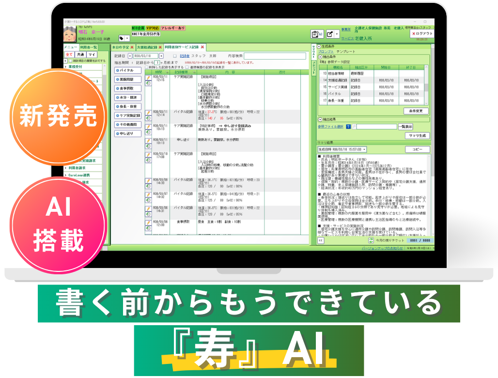 見守りセンサー・ナースコール・インカム・バイタル測定機器・排泄センサーなどのデータを『寿』の介護記録へ自動連携します。介護記録への転記作業・センサー側の設定作業が減り、介護現場の負担軽減になります。