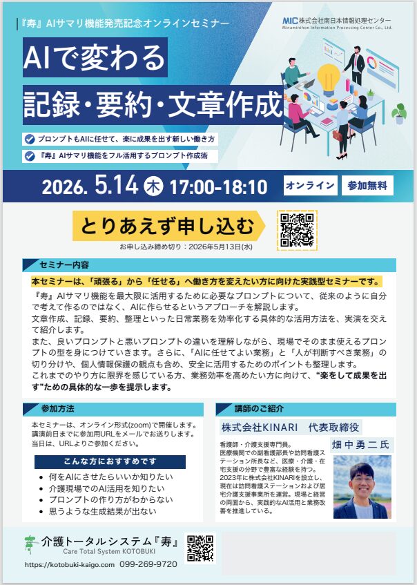 | セミナー | AIで変わる記録・要約・文章作成 −プロンプトもAIに任せて、楽に成果を出す新しい働き方 / 寿AIサマリ機能をフル活用するプロンプト作成術– |